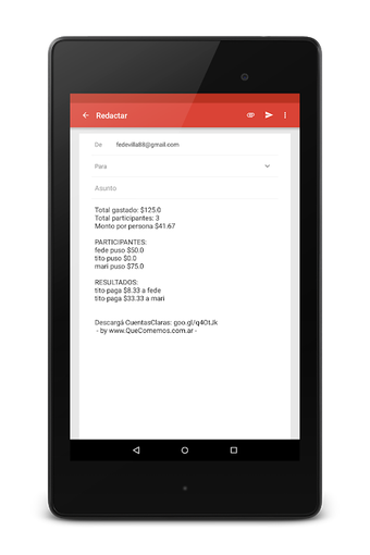 وظيفة حسابات واضحة بسيطة. يمكن للمستخدمين إدخال المشاركين في حدث أو تجمع ومبلغ قد أنفقه كل شخص. يقوم التطبيق بحساب المدفوعات بين الأفراد ، مشيرًا إلى من يحتاج إلى دفع من يحتاج وكم. يمكن مشاركة النتائج بسهولة عبر تطبيق واتساب ، مما يتيح للمستخدمين الاحتفاظ بسجل للحسابات.